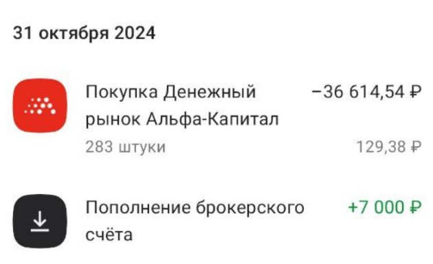 31 октября мы сделали вложение, пополнив наш счет на сумму 36 614 рублей и приобретя фондовые активы.