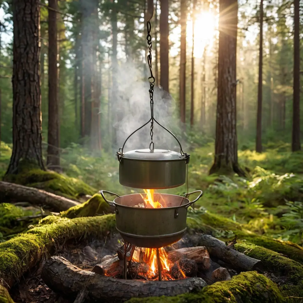 В лесных зонах костер, самый доступный вариант. Для него лучше всего подходит посуда из нержавеющей стали с толстыми стенками и надежной дужкой для подвешивания над огнем. Учтите, что посуда быстро покроется слоем копоти, поэтому для неё стоит предусмотреть отдельный плотный мешочек, чтобы не испачкать остальное снаряжение в рюкзаке.