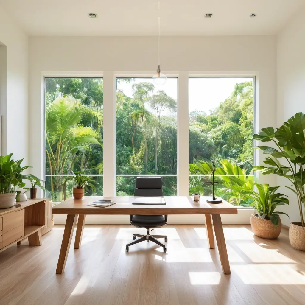 - Добавление природных элементов. Биофильный дизайн (использование растений, дерева, камня) доказано снижает уровень стресса. Даже одно зеленое растение на столе способно улучшить микроклимат и настроение.